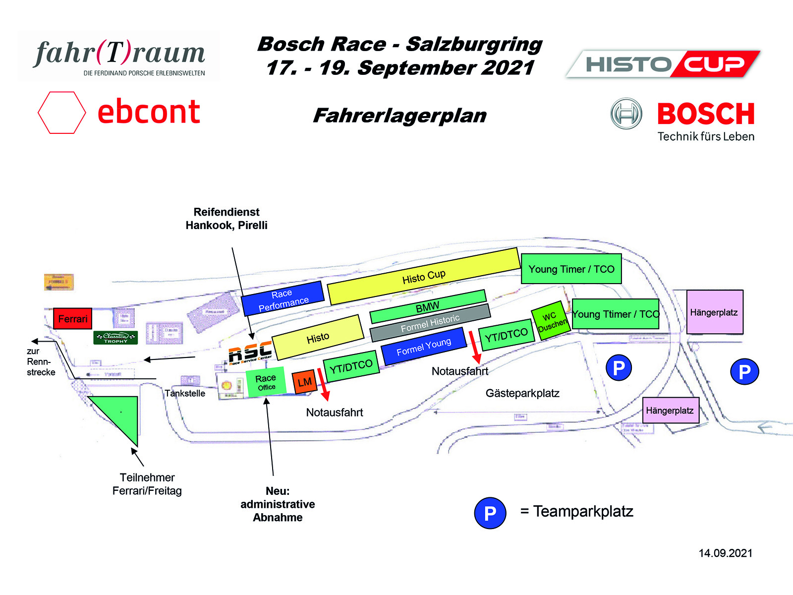Den Anweisungen des Fahrerlagerchefs ist unbedingt Folge zu leisten. Die beiden Notausfahrten sind freizuhalten.