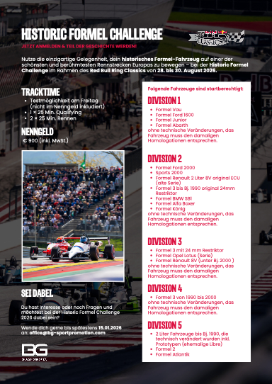🚀 Formelserien erhalten auch die Möglichkeit, bei den Red Bull Ring Classics 2026 im Rahmen der Historic Formel Challenge zu starten (inkl. Training, Qualifying & 2 Rennen).
